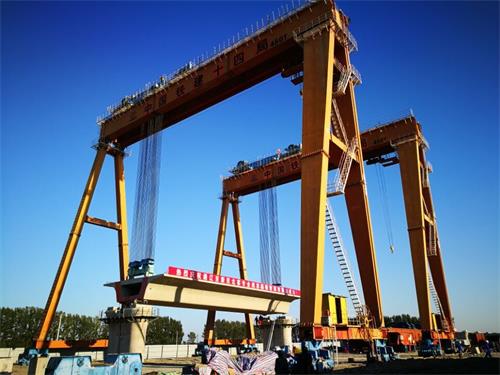 9月19日,位于遼寧彰武縣境內的通遼至新民北客專TLSG-2(DK57+001.27-DK57+033.97)彰武制梁場提梁區, 2臺MG450T輪軌提梁機(凈起升高度33米)將714.8噸的首榀箱梁穩穩平放在76與77號橋墩上。至此,通遼至新民北客專TLSG-2標全線率先架梁開工。